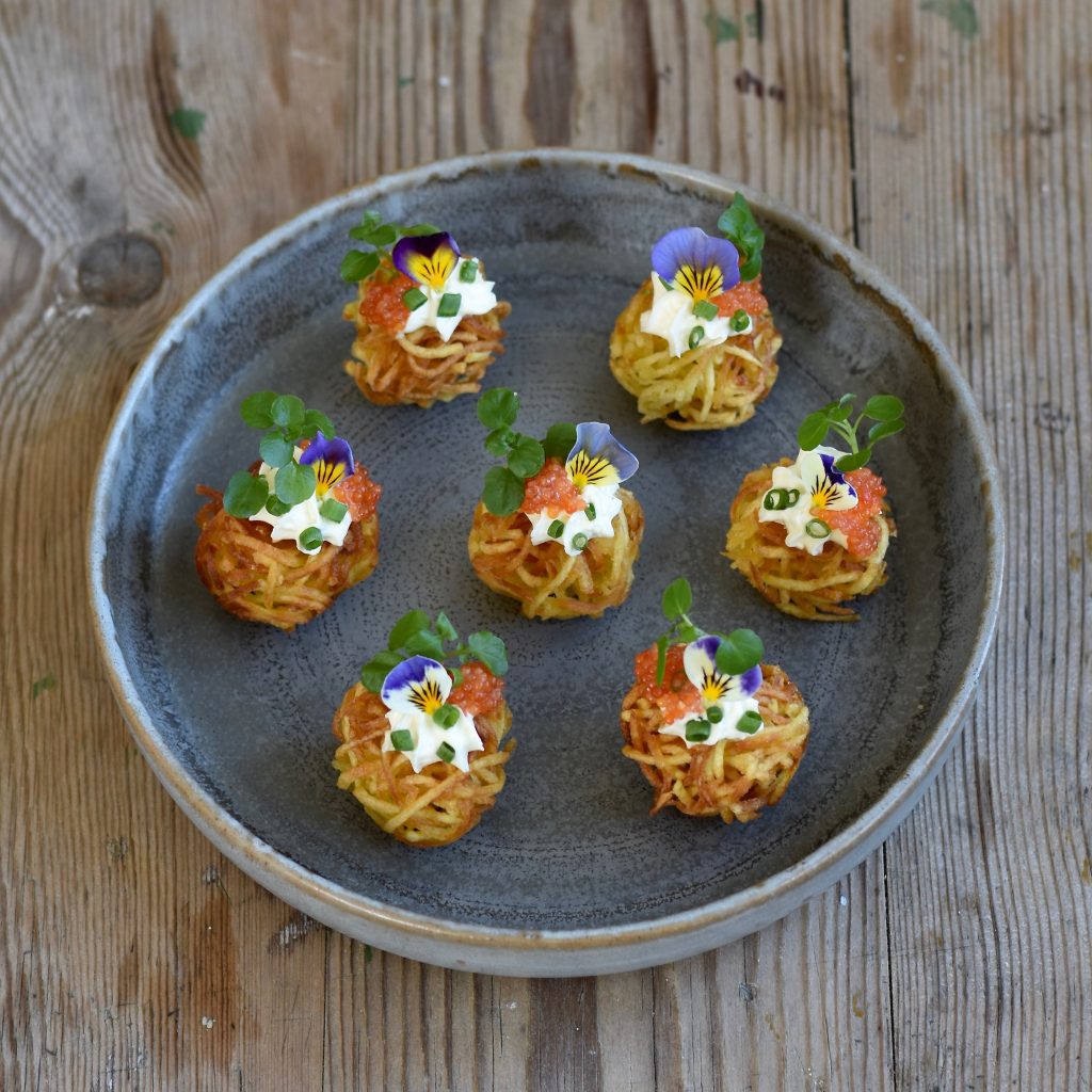 Om man gillar att pilla och har lite tid över så kan man göra små potatisnystan. Det blir så där perfekt frasiga och riktigt, riktigt goda. Pimpa dem tex med lite smetana, stenbitsrom, någon sorts lök och såklart en liten blomma. Servera dem som ett litet drinktilltugg, en lätt förrätt eller som ett tillbehör i rätter där du skulle ha serverat någon annan friterad potatis.
