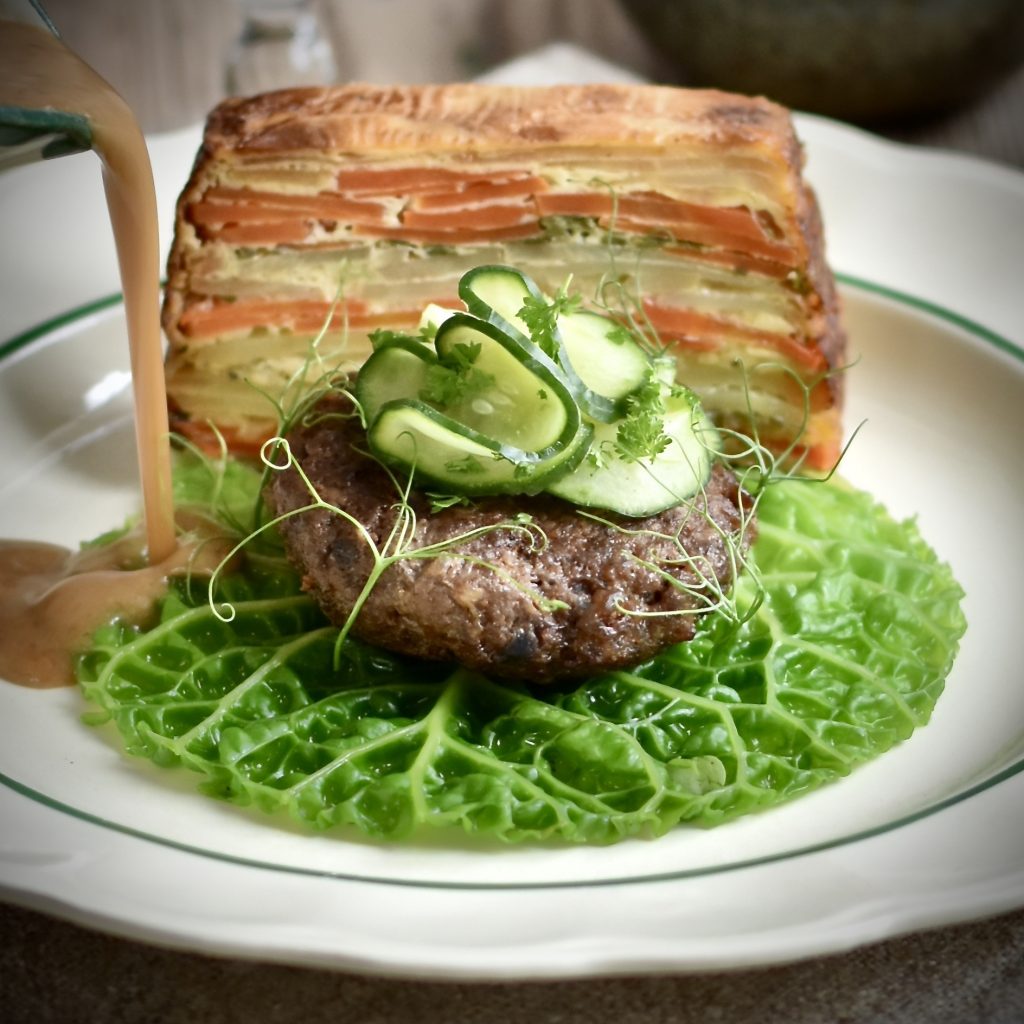 På bilden nedan så serverar jag terrinen tillsammans med en viltfärsbiff, i detta fall gjort på dovhjort. När jag gör mina viltfärsbiffar så använder jag ofta det här receptet.